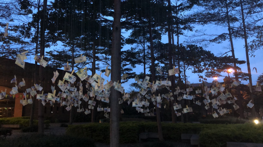 Sí, tal cual como leíste árboles con billetes de veinte mil y cincuenta mil pesos